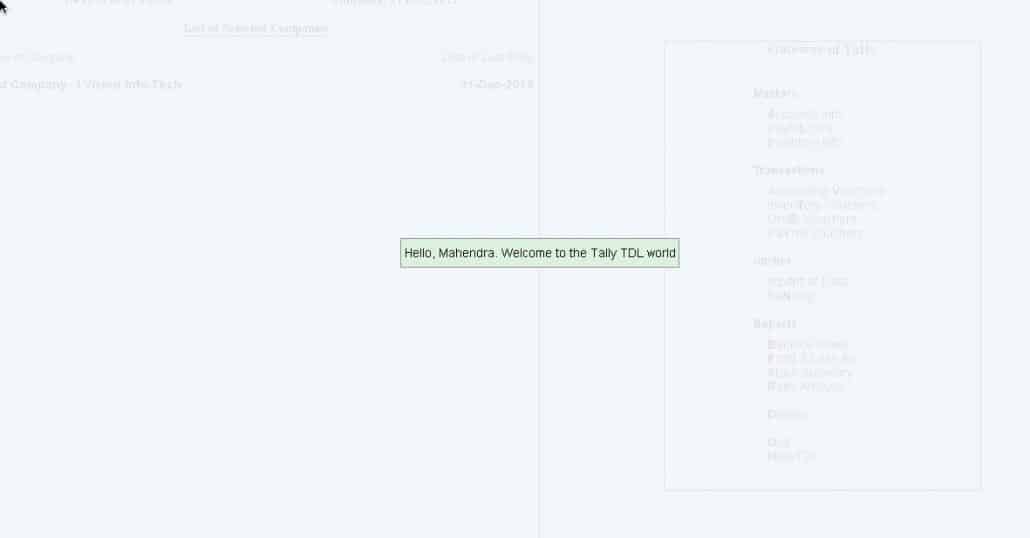 set as : “ Hello, Mahendra. Welcome to the Tally TDL world “